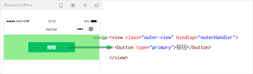 点击内部的按钮时,点击事件以冒泡的方式向外扩散,也会触发外层 view 的 tap 事件处理函数。