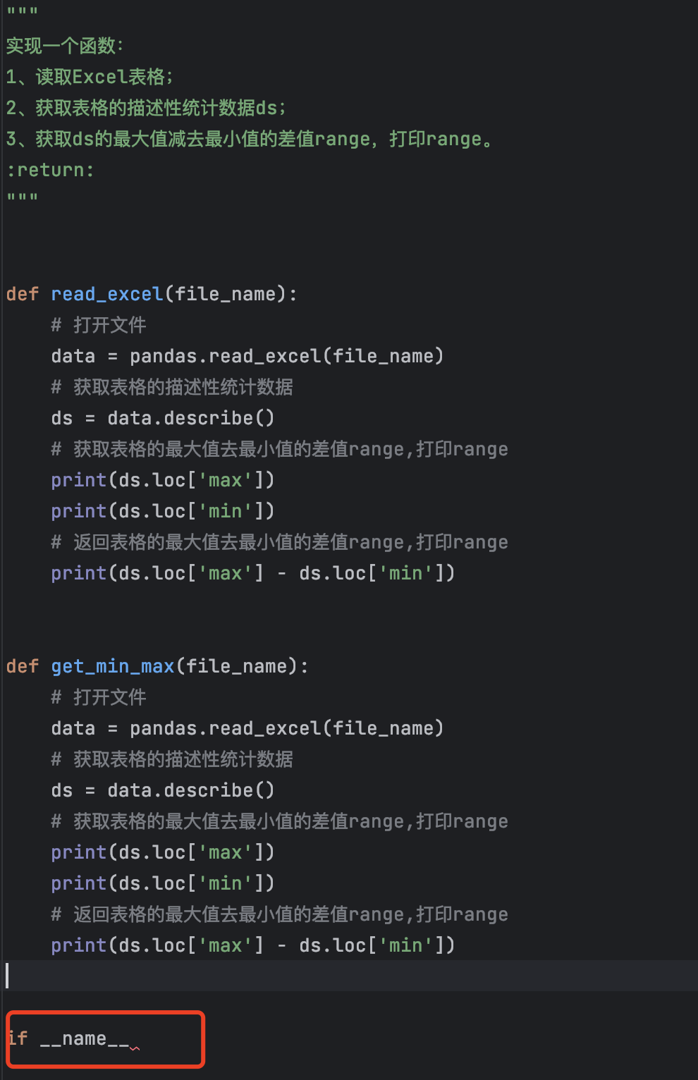 这次代码实现的关键在于 pandas 库,借助它读取Excel文件并打印统计数据信息。