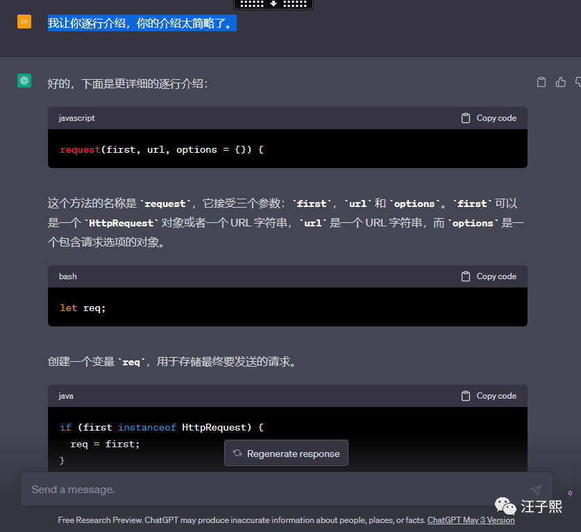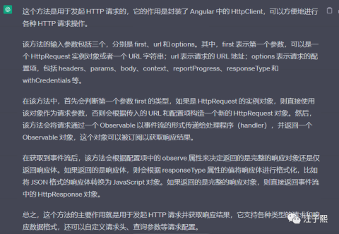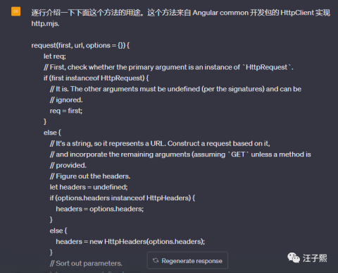 那么我首先让 ChatGPT 给我介绍整个 request 方法大致完成一件什么事情,使用 prompt:逐行介绍一下下面这个方法的用途。这个方法来自 Angular common 开发包的 HttpClient 实现 http.mjs.