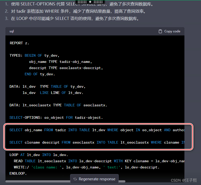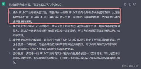 我询问 ChatGPT 以上代码是否存在可以优化的地方,ChatGPT 的回复一语中的,排在第一点的建议就非常切中要害:将第二个 SELECT 语句放在循环体之外: