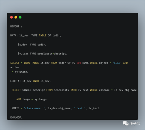 我首先故意写了一段存在性能问题的 ABAP 代码。这段代码首先从数据库表 tadir 里读取 200 条 Class 定义,然后循环这 200 条记录,在循环体内再次根据定义里的 Class 名称字段,到另一张数据库表 seoclasstx 里读取 Class 的描述信息。