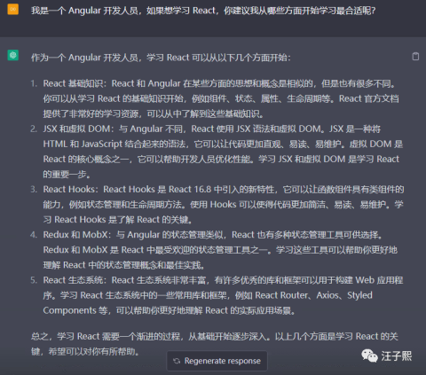 我使用 Angular 开发已经有一段时间了,现在我想学习 React,因此向 ChatGPT 咨询,让它给我建议一些 React 的学习要点: