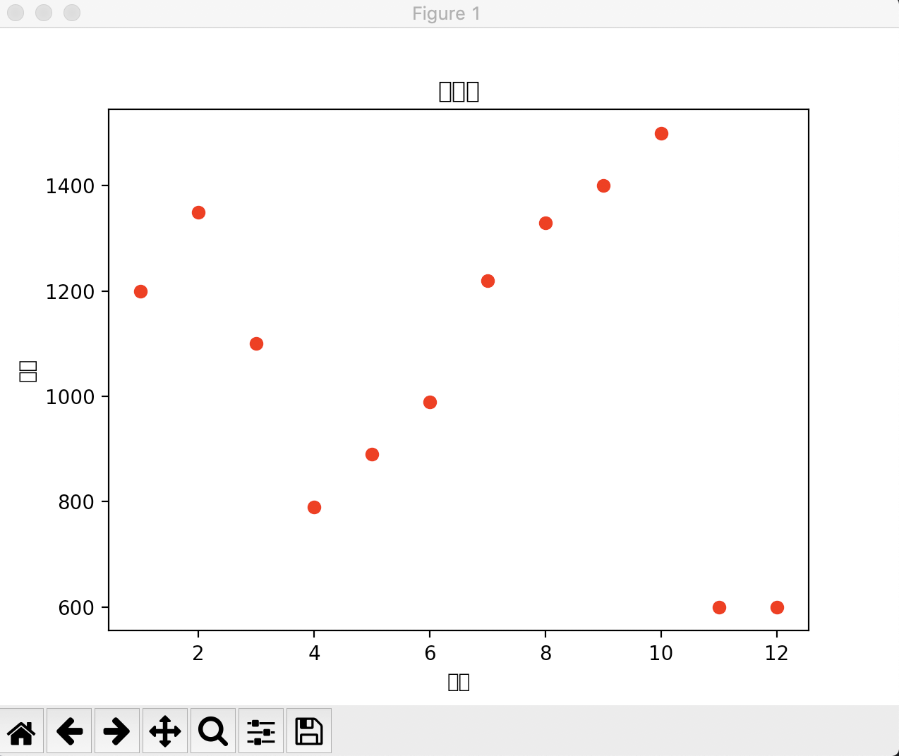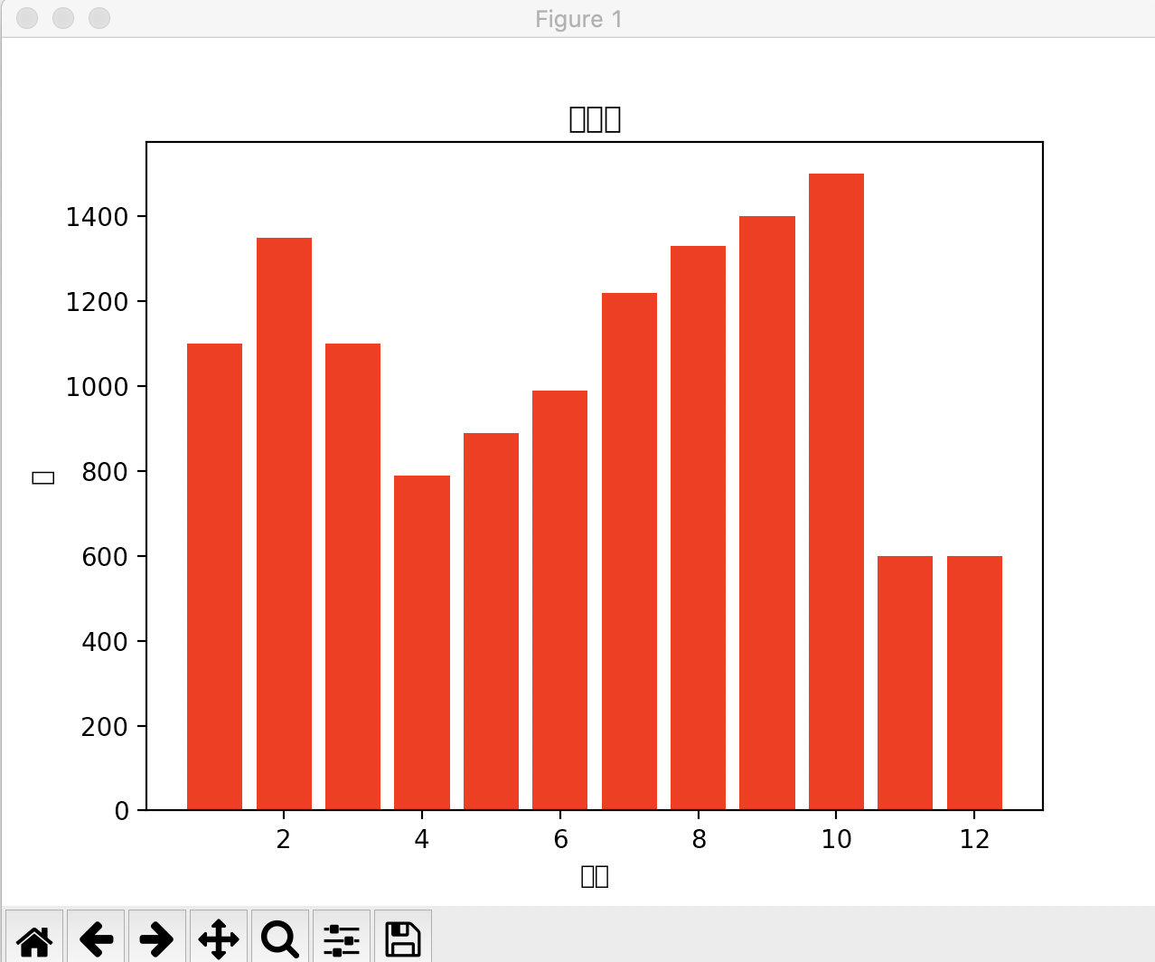 2、定义销量sales=[1200,1350,1100,790,890,990,1220,1330,1400,1500,600,600];