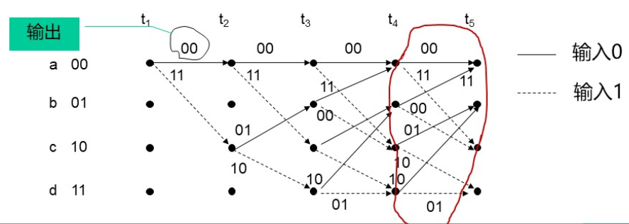 状态图方框内的状态表示寄存器最右端(L-1)级的可能内容,状态间的路径表示由此状态转移是的输出分支字。寄存器的状态表示为a=00,b=01,c=10,d=11.对应于两种可能的输入比特,从每一个状态出发只有两种转移,状态转移时的输出分支字标注在相应的转移路径旁。图中实线表示输入比特为0的路径,虚线表示输入比特为1的路径。