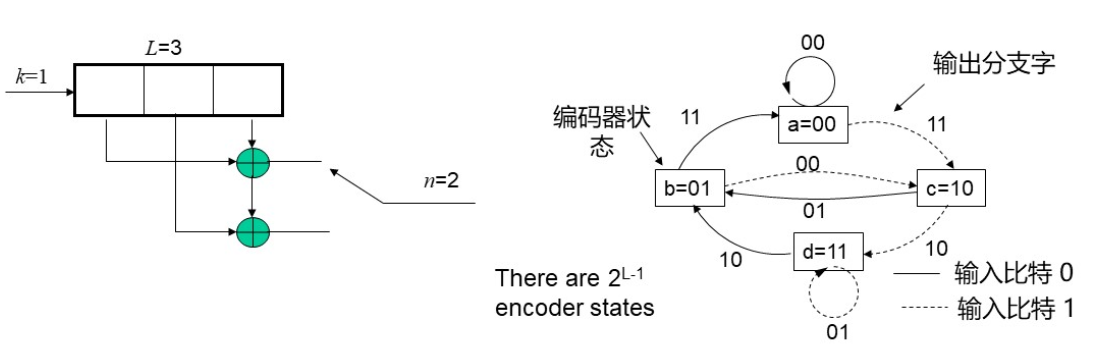 卷积码由三个整数描述, (n, k, L), 其中k/n也表示编码效率,L称为约束长度; 表示在编码移位寄存器中k元组的级数,k表示编码时一次输入编码器的码元数。