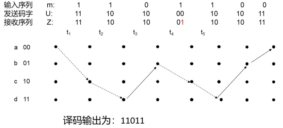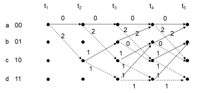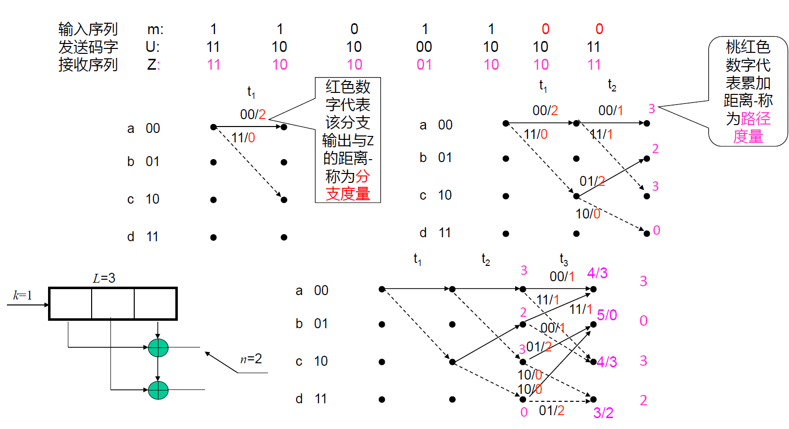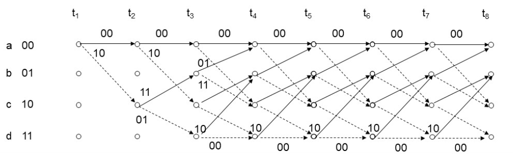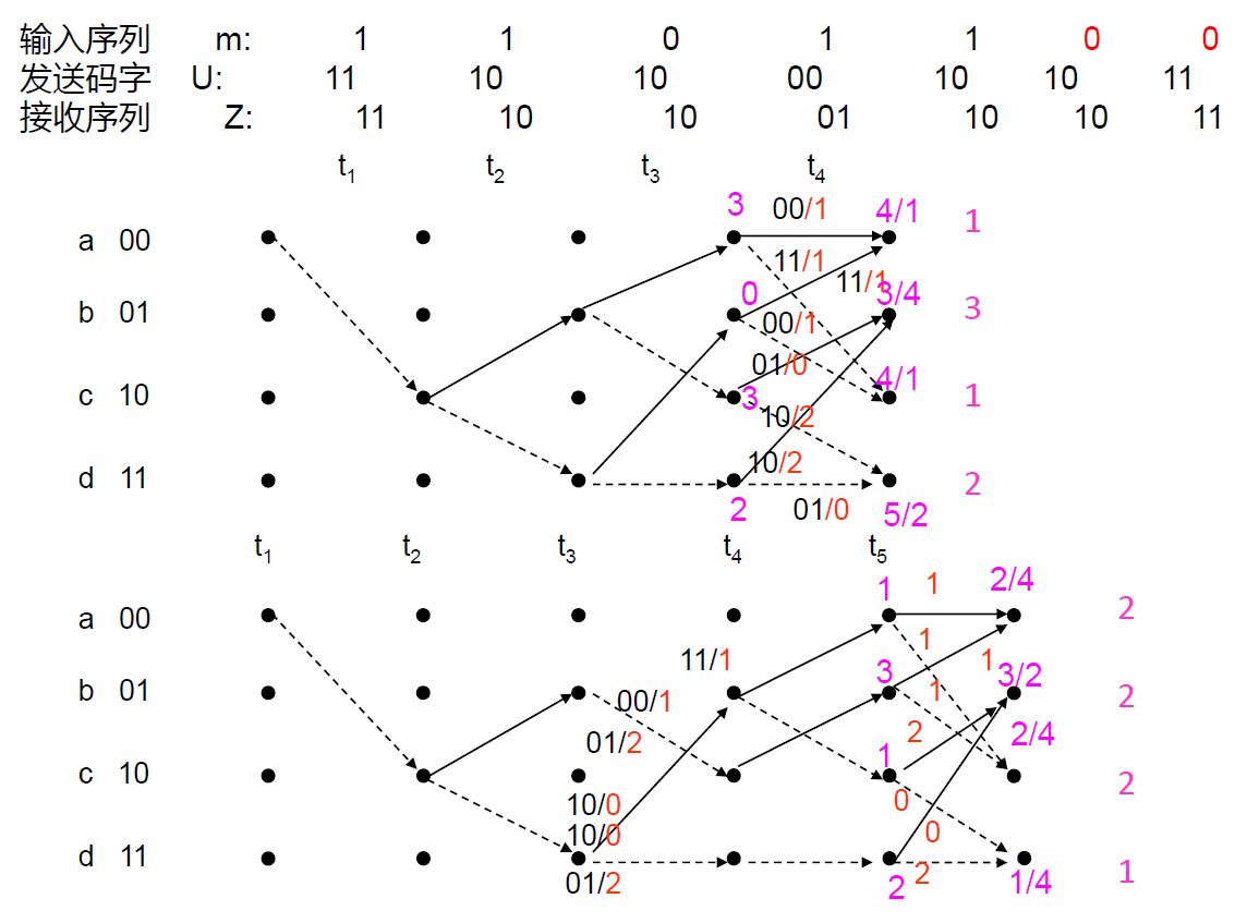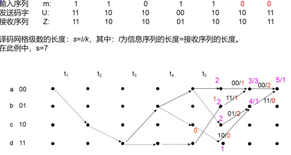 维特比译码算法是基于网格图进行的。译码时先将接收序列按照n分组,然后计算每分组与相应网格图中各分支的输出之间的汉明距离。