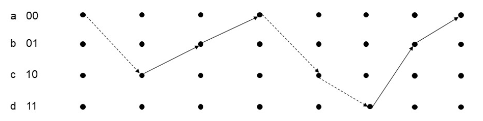 对所有状态都将进行这样的选路操作,译码器不断的在网格图上深入,通过去除可能性最小的路径实现判决。较早地抛弃不可能的路径降低了译码的复杂性。注意,选择最优路径可以表述为选择具有最大似然度量的码字,或者选择具有最小距离的码字。