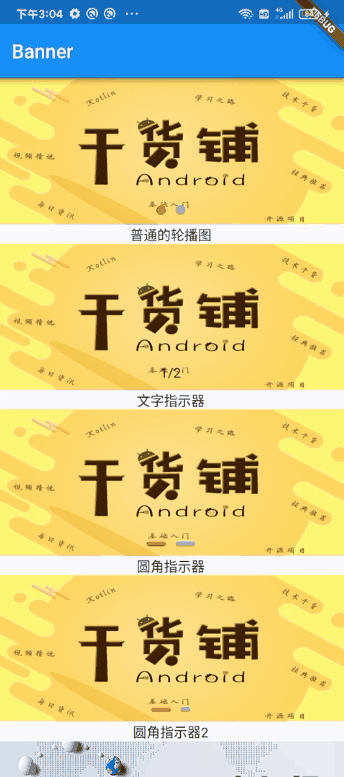 利用PageView,封装了一些特定的效果,比如文字指示器,圆角指示器,以及指示器的位置,轮播图片的缩进展示等等,录制了一个Gif效果图,如下: