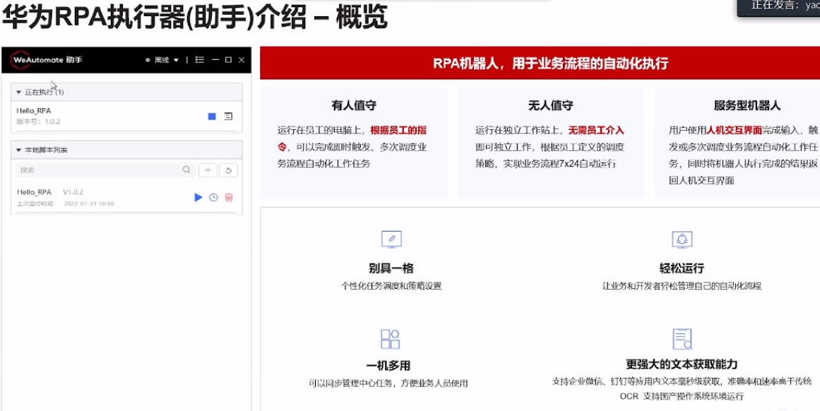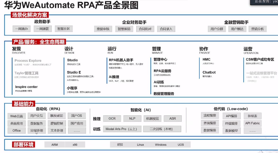 华为WeAutomate RPA产品的场景化解决方案有:政务助手,企业财务助手,金融营销助手。它的产品/服务需经历发现、设计、运行、管理、协作、运营一个全生命周期。它的基础能力:自动化(RPA)、智能化AI、低代码(Low-code)。它的部署环境:ARM、x86、欧拉、Linux、Windows、UOS。