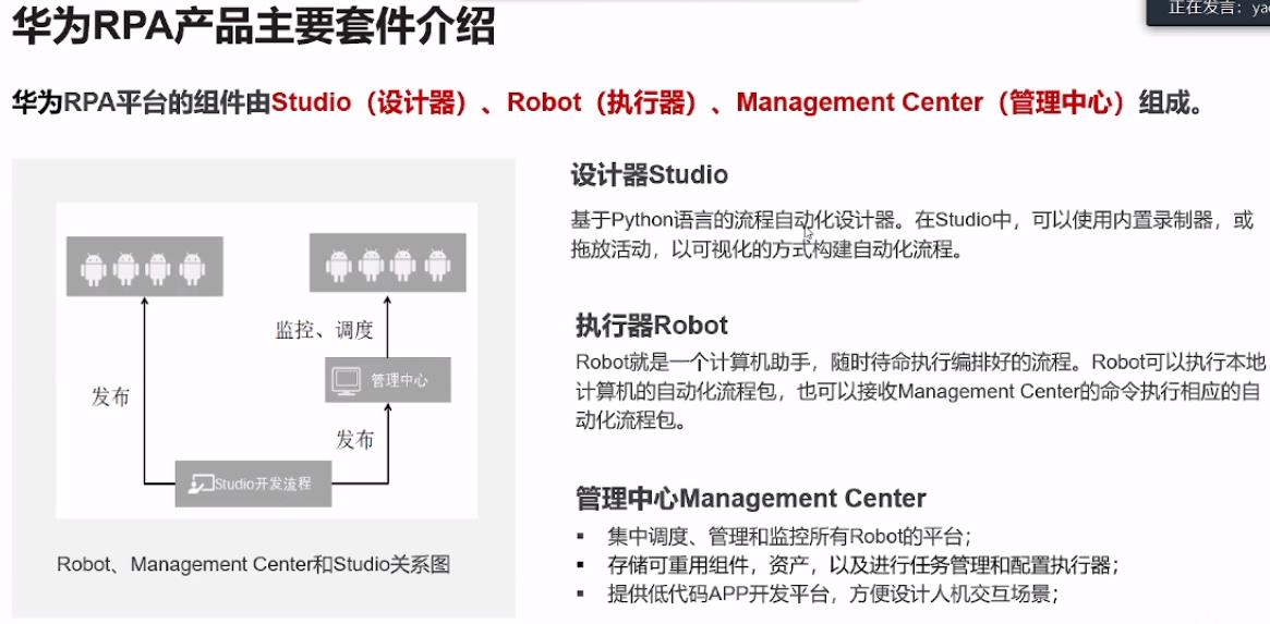 华为RPA平台的组件由Studio(设计器),Robot(执行器),Management Center(管理中心)组成。