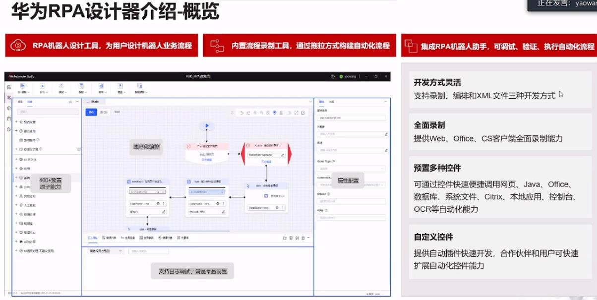 从总体设计来看,分三类。RPA机器人设计工具,为用户设计机器人业务流程;内置流程录制工具,通过拖拉方式构建自动化流程;集成RPA机器人助手,可调试、验证、执行自动化流程。华为RPA设计器有以下的特点: