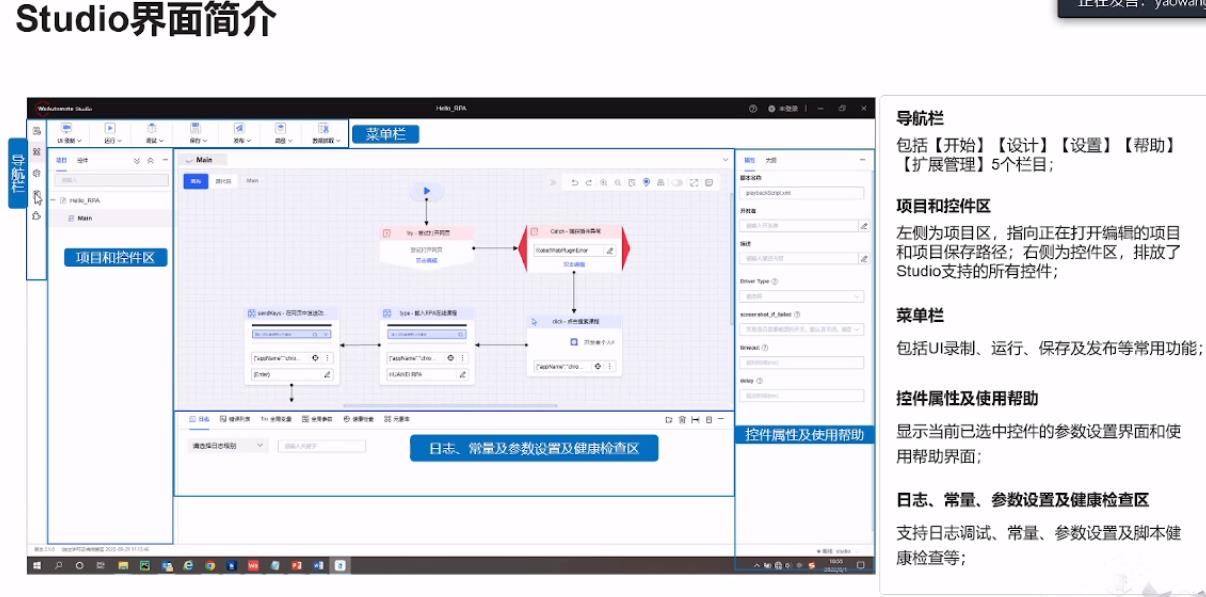 基于Python语言的流程自动化设计器。在Studio中,可以使用内置录制器,或拖放活动,以可视化的方式构建自动化流程。