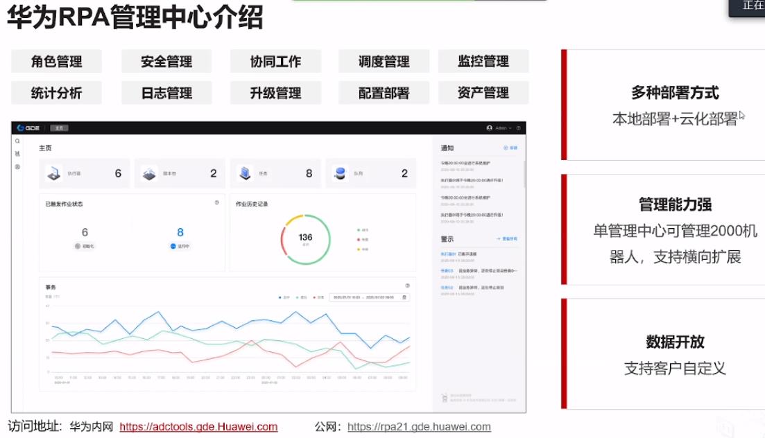 华为RPA管理中心有以下功能:角色管理、安全管理、协同工作、调度管理、监控管理、 统计分析、日志管理、 升级管理、配置部署、资产管理。它有以下一些特点: