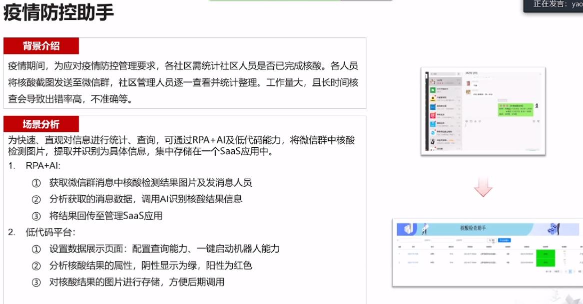 疫情期间,为应对疫情防控管理要求,各社区需统计社区人员是否已完成核酸。各人员将核酸截图发送至微信群,社区管理人员逐一查看并统计整理。工作量大,目长时间核查会导致出错率高,不准确等。为快速、直观对信息进行统计、查询,可通过RPA+AI及低代码能力,将微信群中核酸检测图片,提取并识别为具体信息,集中存储在一个SaaS应用中。