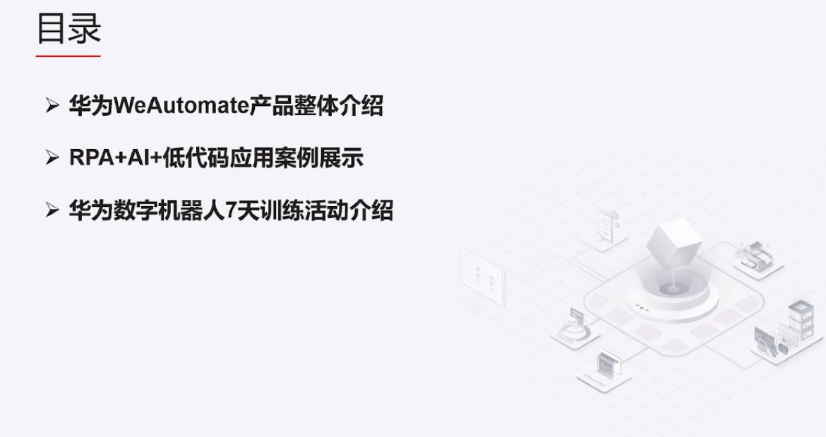 本文以发票报销等多个场景为例,揭秘如何使用RPA+AI+低代码快速构建小而美的SaaS应用。我们将从三个方面来介绍本次内容。首先,对华为WeAutomate产品进行整体介绍。然后开始进行分享,进行RPA+AI+低代码应用案例展示。最后,通过对华为数字机器人7天训练营活动的介绍,让大家更深入地了解七天训练营活动的主要流程,还有一些主要的课程组成结构。