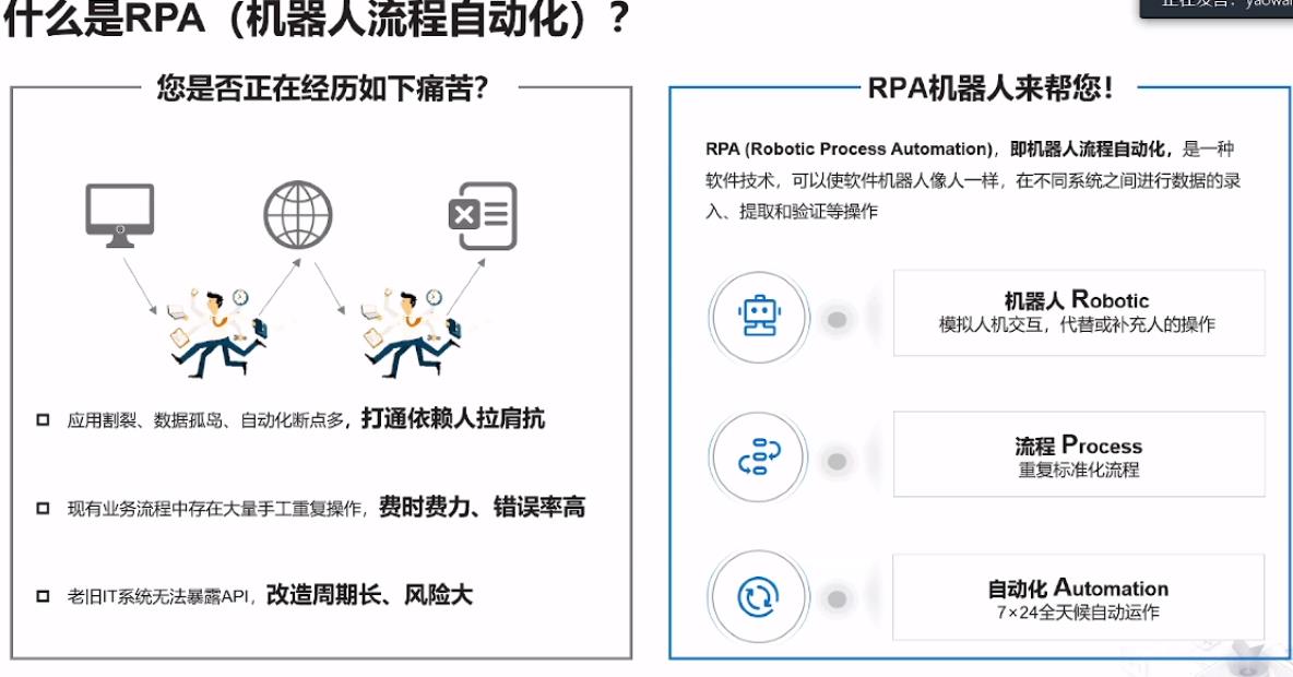 上边的这些问题,都可以由RPA机器人来帮助解决。RPA(Robotic Process Automation),即机器人流程自动化,是一种软件技术,可以使软件机器人像人一样,在不同系统之间进行数据的录入、提取和验证等操作。RPA有以下三大特点:1.机器人Robotic:模拟人机交互,代替或补充人的操作;2.流程Process:重复标准化流程;3.自动化Automation :7x24全天候自动运作。