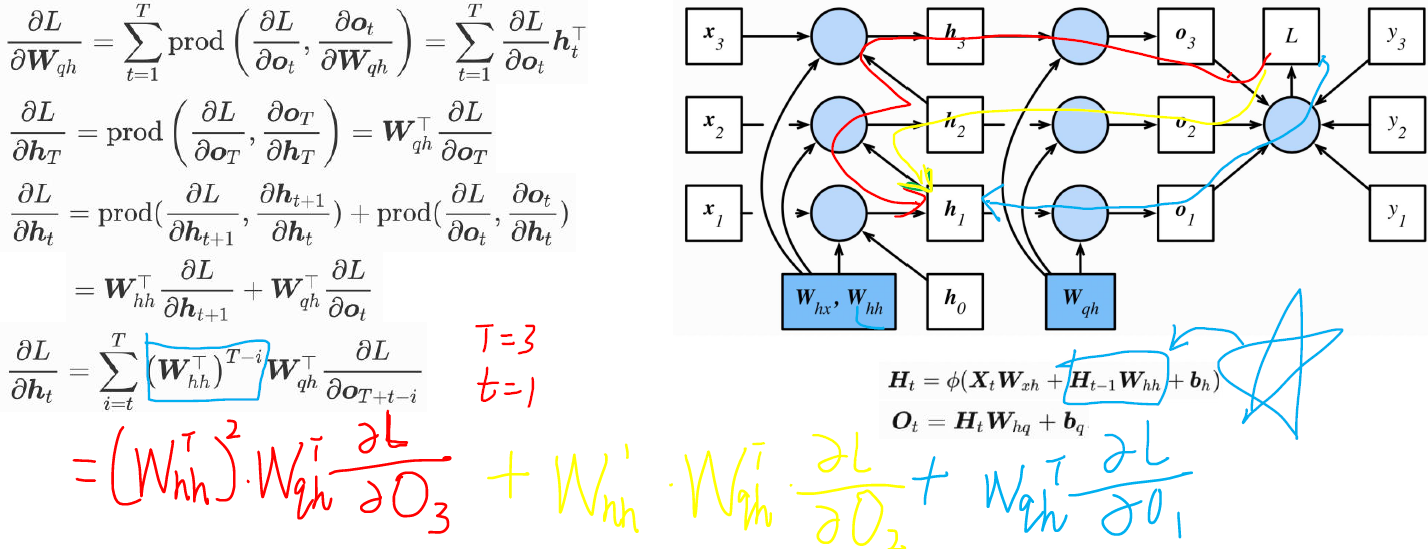 ∂Wqh∂L∂hT∂L∂ht∂L∂ht∂L=t=1∑Tprod(∂ot∂L,∂Wqh∂ot)=t=1∑T∂ot∂Lht⊤=prod(∂oT∂L,∂hT∂oT)=Wqh⊤∂oT∂L=prod(∂ht+1∂L,∂ht∂ht+1)+prod(∂ot∂L,∂ht∂ot)=Whh⊤∂ht+1∂L+Wqh⊤∂ot∂L=i=t∑T(Whh⊤)T−iWqh⊤∂oT+t−i∂L