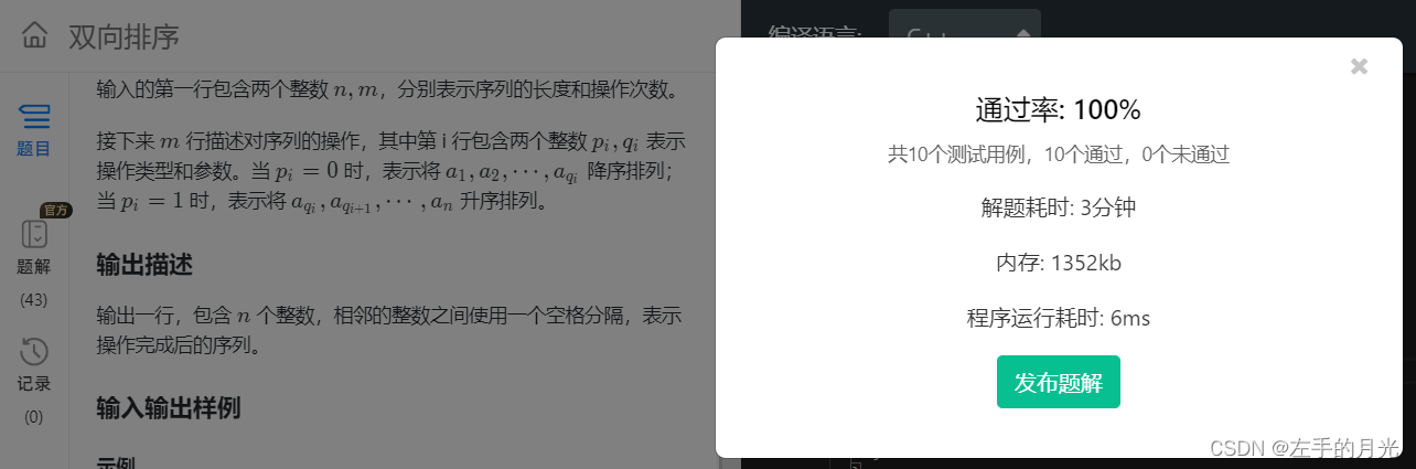 接下来 mm 行描述对序列的操作,其中第 i 行包含两个整数 pi,qi 表示操作类型和参数。当 pi=0 时,表示将 a1,a2,⋅⋅⋅,aqi 降序排列;当 pi=1 时,表示将 a_{q_i} , a_{q_{i+1}}, \cdots, a_naqi,aqi+1,⋯,an 升序排列。