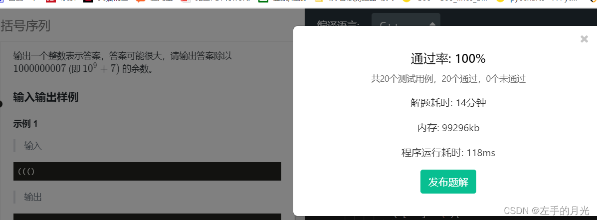 例如,对于括号序列 (((),只需要添加两个括号就能让其合法,有以下几种不同的添加结果:()()()、()(())、(())()、(()()) 和((()))。