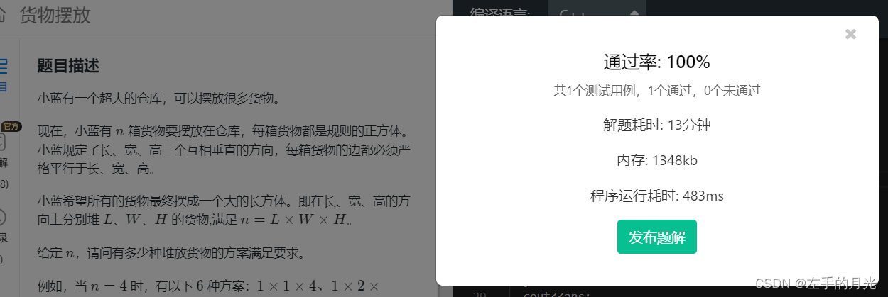 小蓝希望所有的货物最终摆成一个大的长方体。即在长、宽、高的方向上分别堆 L、W、H 的货物,满足n=L×W×H。