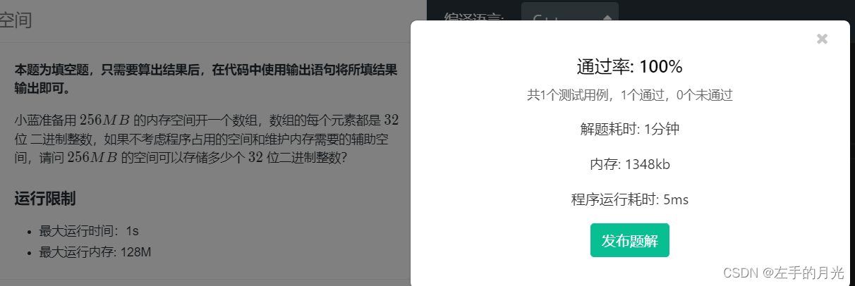 小蓝准备用 256MB256MB 的内存空间开一个数组,数组的每个元素都是 3232位 二进制整数,如果不考虑程序占用的空间和维护内存需要的辅助空间,请问 256MB256MB 的空间可以存储多少个 3232 位二进制整数?