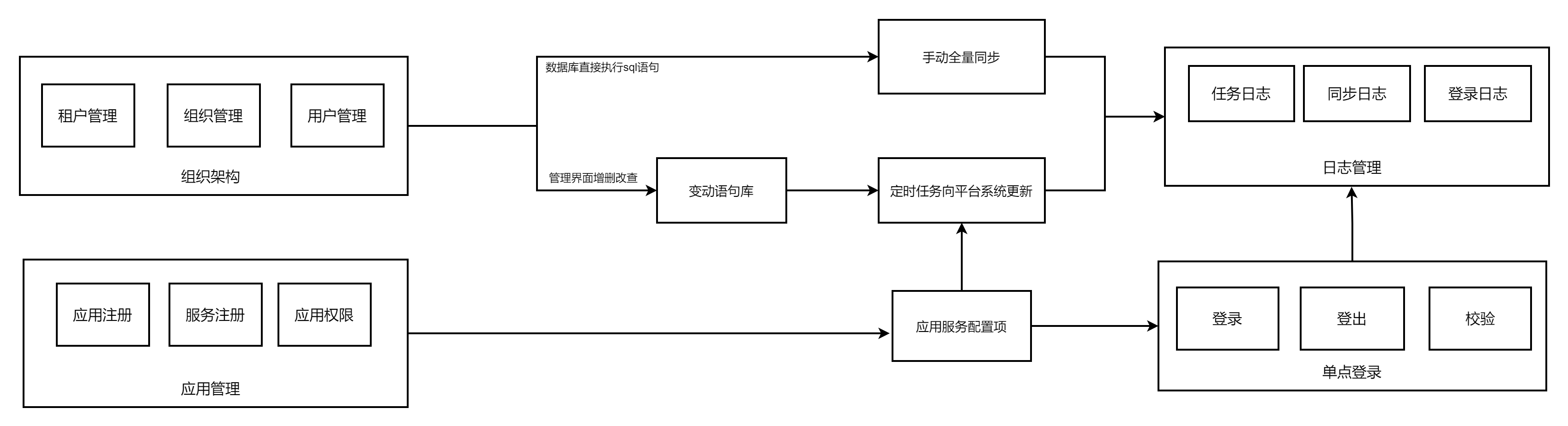 后端设计如下图所示,主要包含应用/服务注册,组织架构同步,日志管理三大块