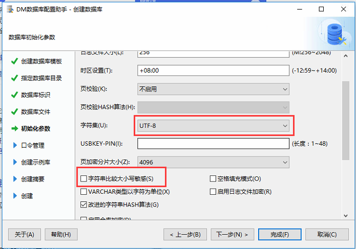 安装完毕后打开DM数据库配置助手创建数据库,设置字符集utf8,去除字符大小写敏感