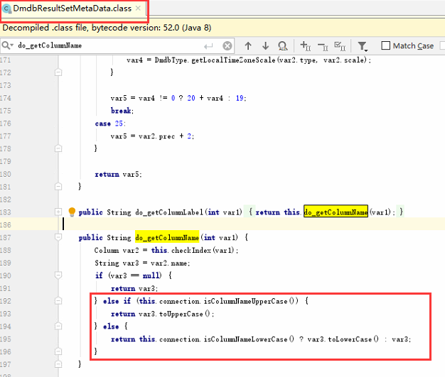 我们可以通过混合使用jdbcTemplate进行查询的通用操作,调用query方法,传入自定义的ResultSetExtractor,得到jdbc原生的ResultSet对象,取出ResultSetMetaData转换成DmdbResultSetMetaData,其中的columns对象为私有对象且无方法访问,通过反射取出即可,通过columns获取到数据库实际的列名