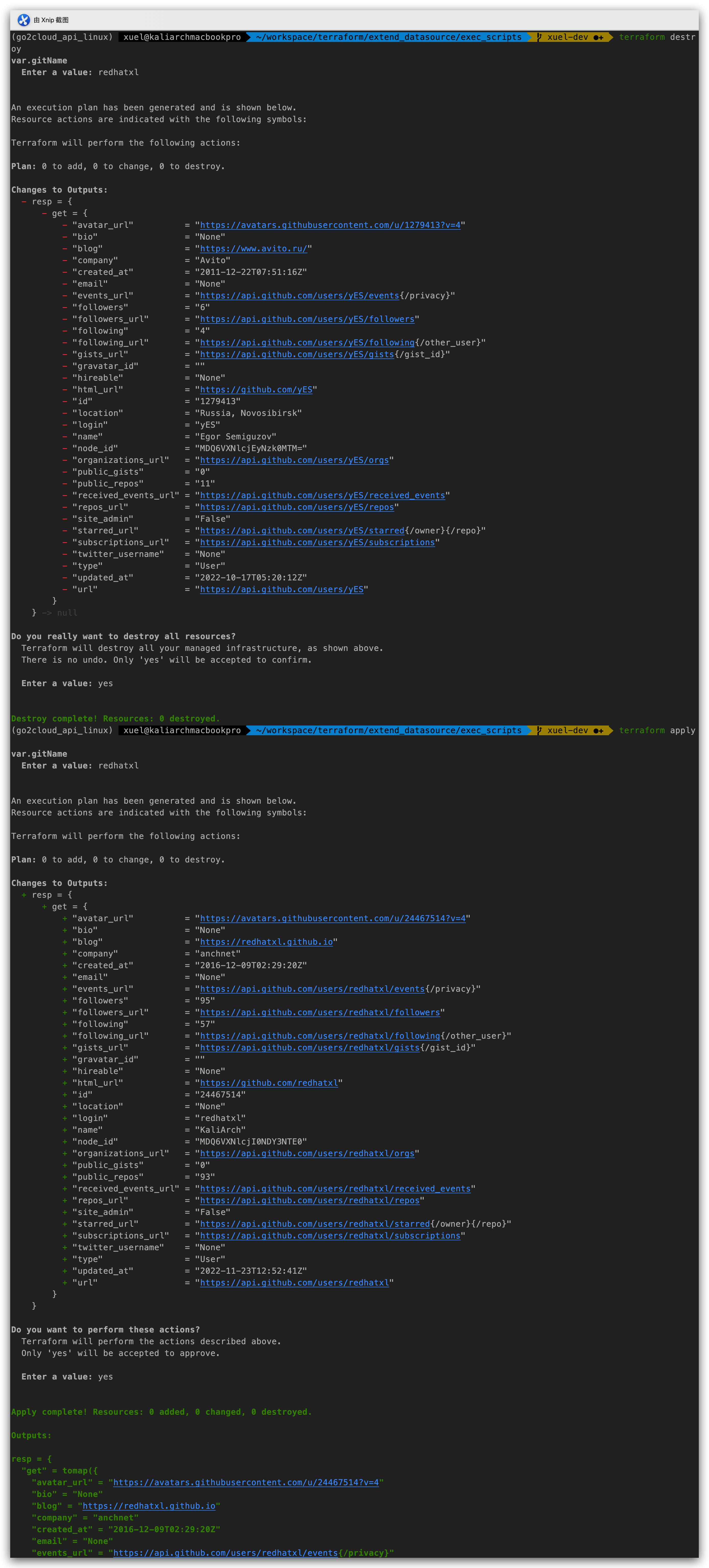 除了Terraform直接通过调用http provider接口获取数据外,还可以使用执行本地Shell/Python脚本,脚本内部实现调用外部接口获取数据,再将数据进行传入到Terraform进行使用。