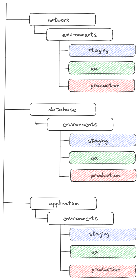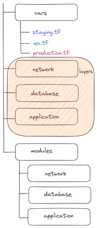 在这个项目结构中,每个环境都有包含层的目录。您可以在下面看到登台环境的网络配置: