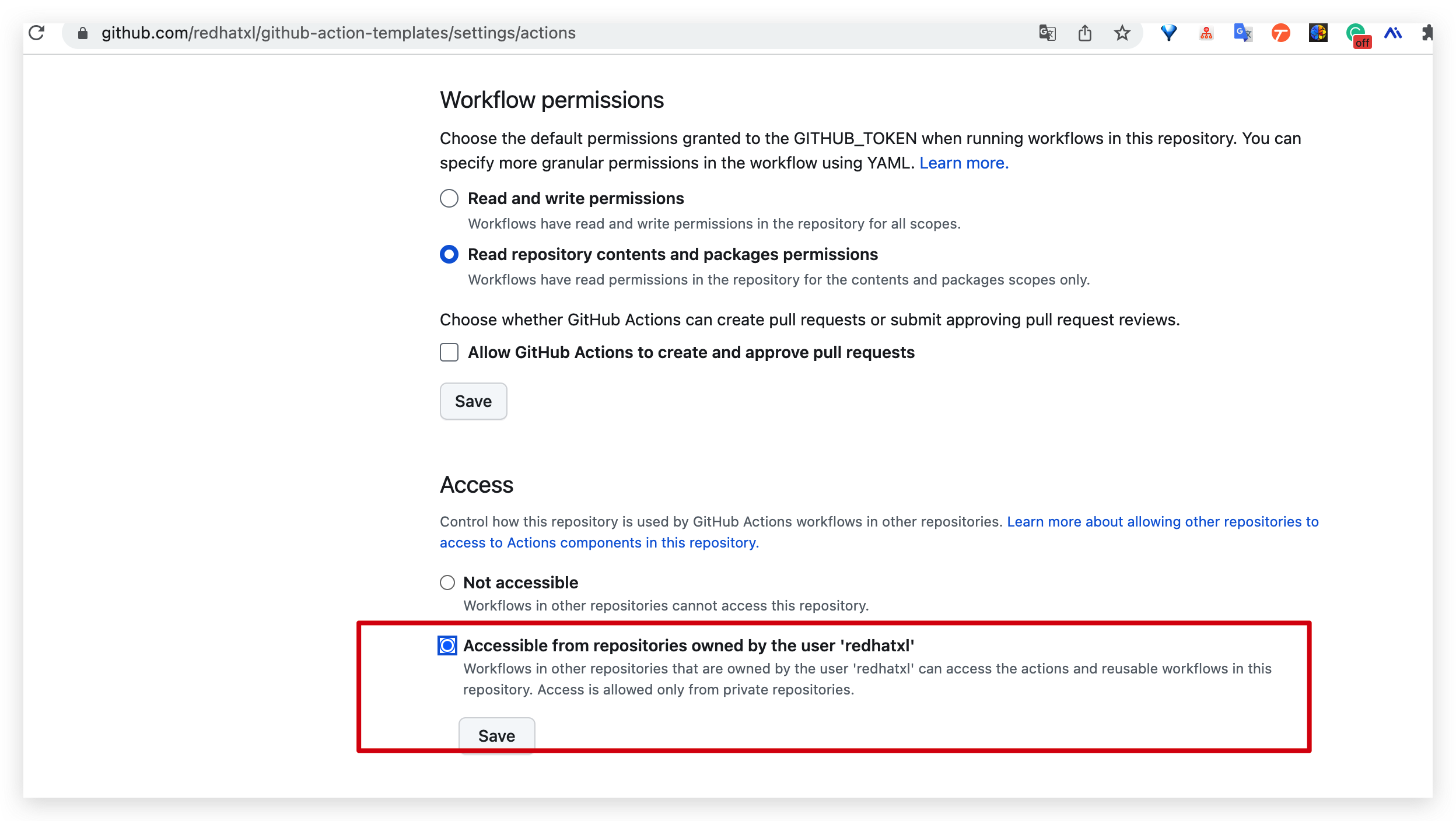 如果 github-action-templates 使用私有仓库,则需要模版库权限,否则业务仓库找不到模版库。