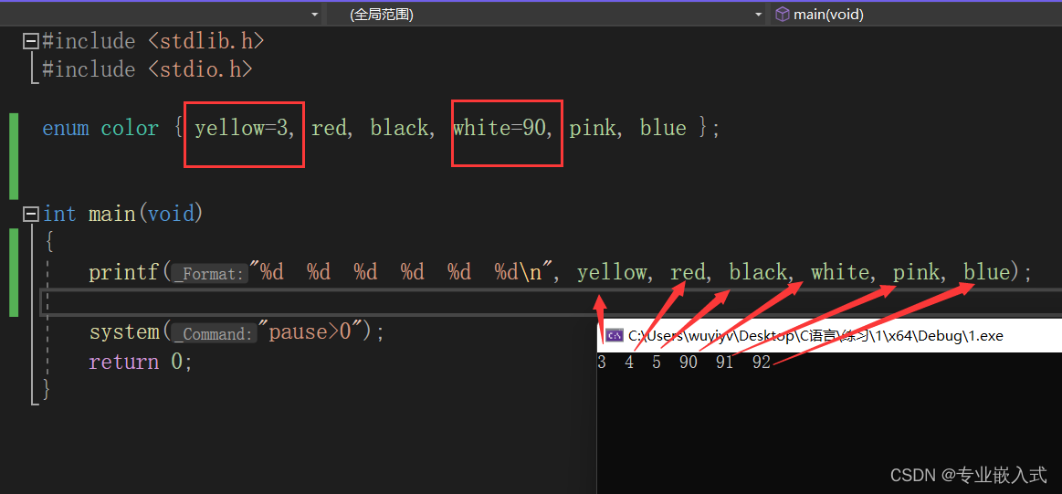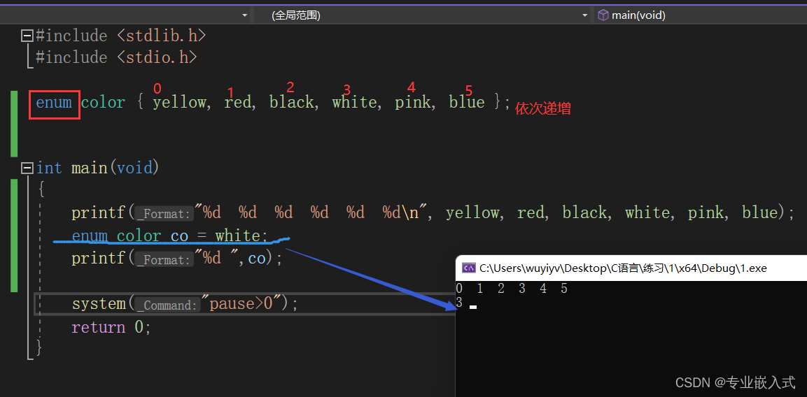 【摘要】 @TOC 前言 一、枚举: 1.枚举类型,关键词枚举:关键词 enmu。(一组有名字的 int 类型的数据类型)例如:enum color { yellow, red, black, white, pink, blue }; / / 定义了一个数据类型,该整型类型有 6 个数据,默认是从 0 开始,依次递增一个。yellow 是0 的名字,可以直接使用yellow代替0,yellow 不是变...