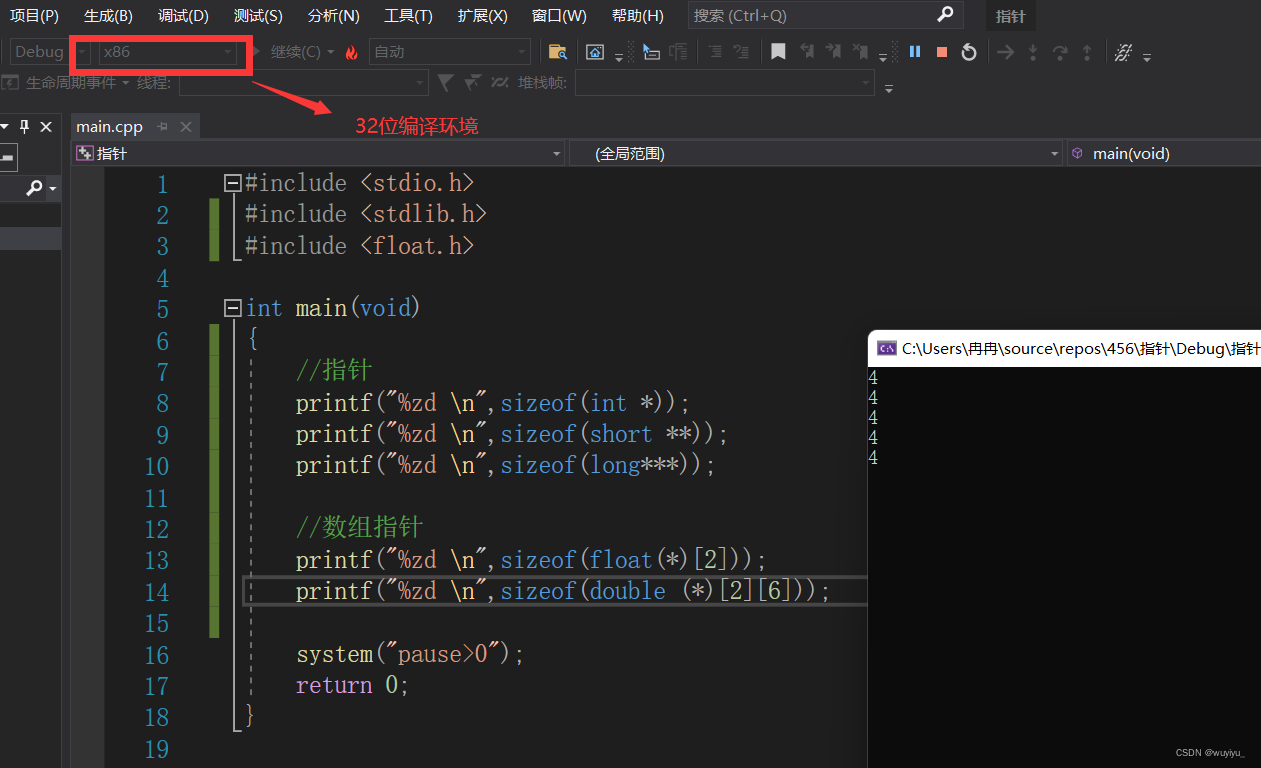 【摘要】 @TOC 前言变量有大小,同样指针也有它的大小。 一、指针的大小:(一切指针都是如此)不同编译环境下,指针的大小不一样:32 位编译环境下,是4 字节64 位编译环境下,是8 字节 二、指针的大小的演示: 三、void *类型:通用指针类型 : void *通用指针类型就是没有值具体类型,什么指针都可以装。例如:int a ; void *p=&a;float b ; void *p=&...