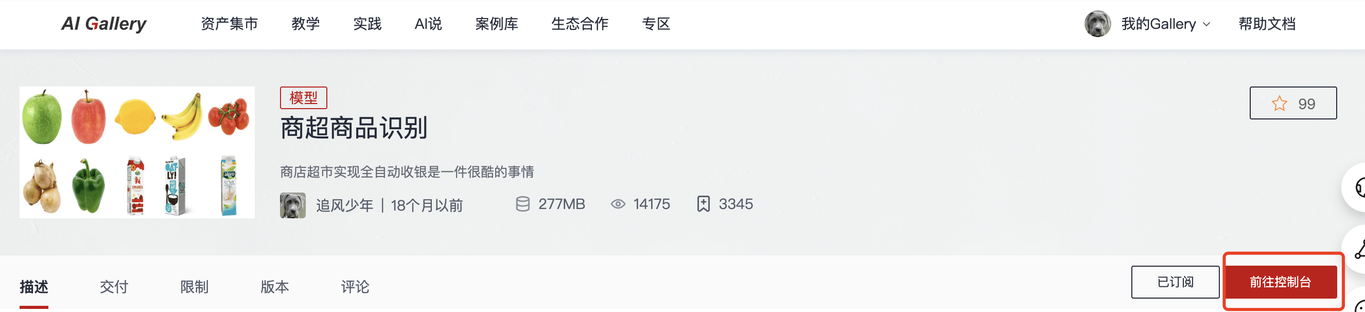 入口二:在ModelArts管理控制台的左侧导航栏,找到“AI Gallery”,单击进入。在“AI Gallery”页面,选择“资产集市 > 模型”,搜索“商超商品识别”,单击名称进入模型详情页。
