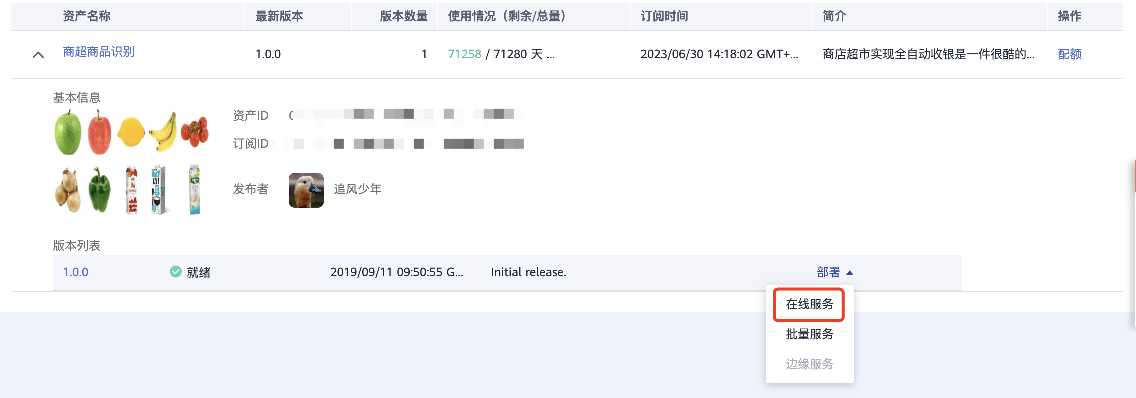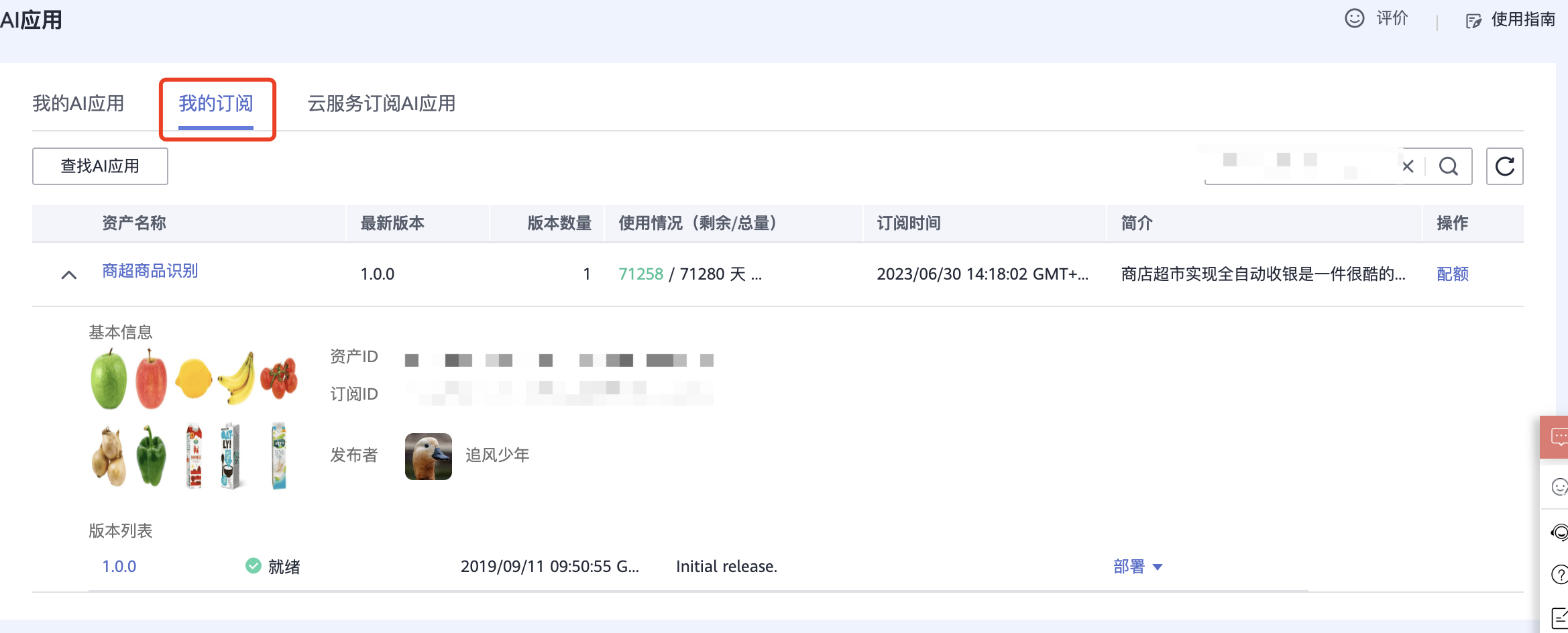 - 在“AI应用管理 > AI应用 > 我的订阅”页面,单击模型名称前面的“展开按钮”,在展开的版本列表中单击“部署 > 在线服务”跳转至部署页面。