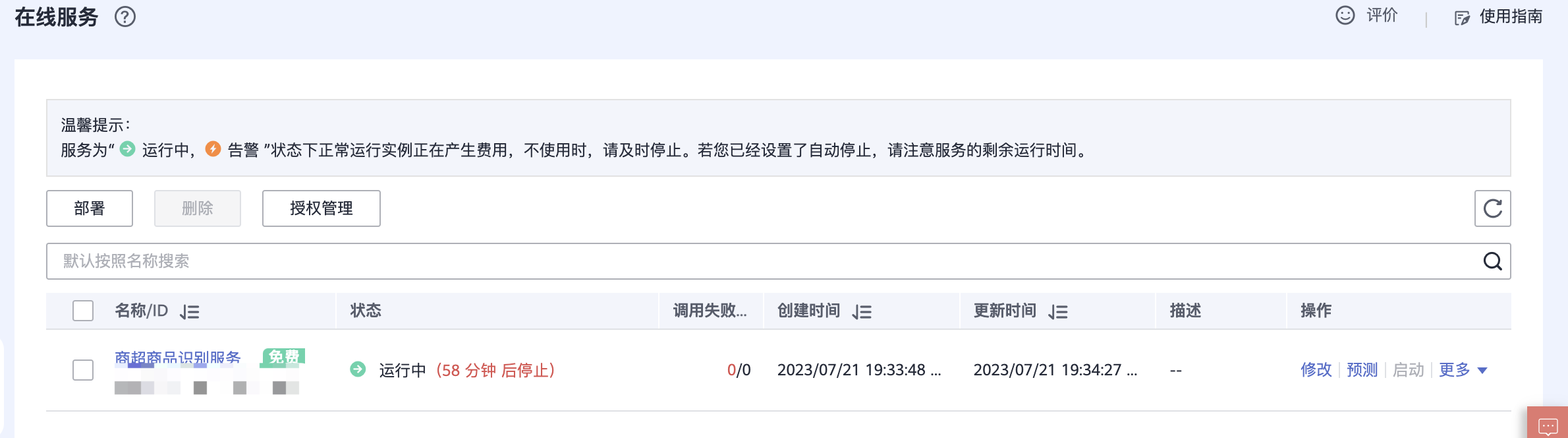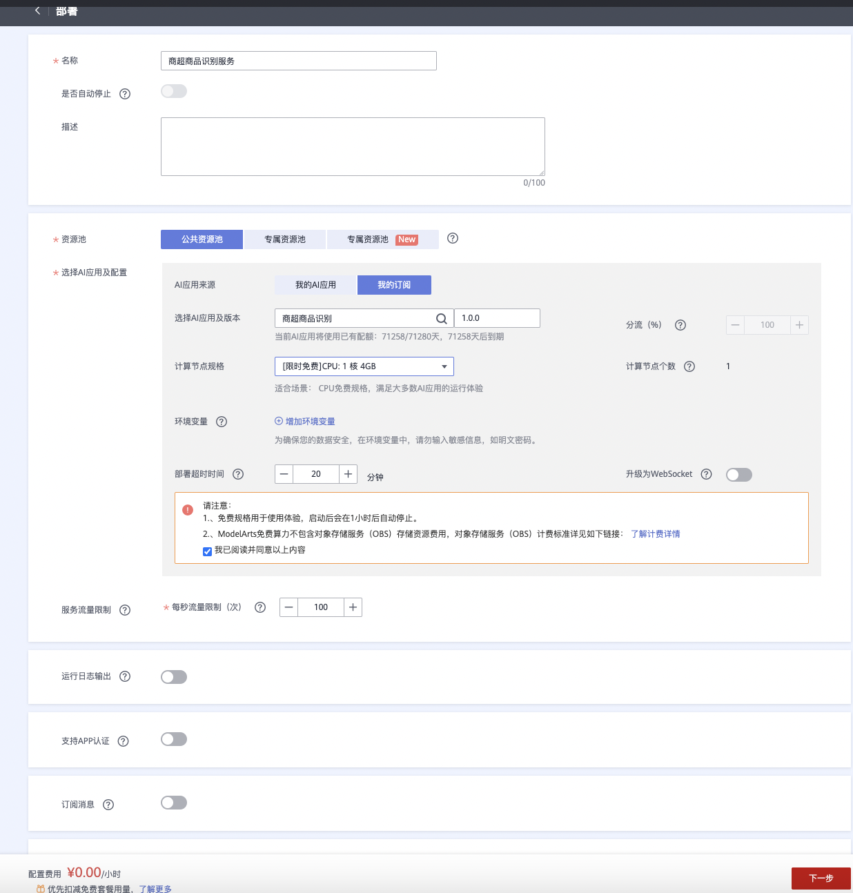 - “名称”:自定义一个在线服务的名称,也可以使用默认值,此处以“商超商品识别服务”为例。