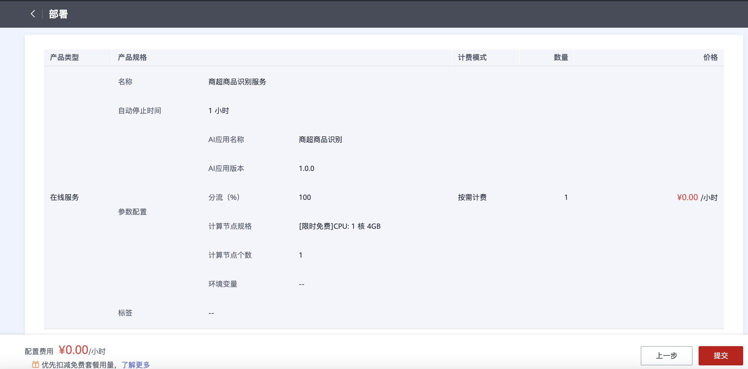 - 参数配置完成后,单击“下一步”,确认规格参数后,单击“提交”启动在线服务的部署。