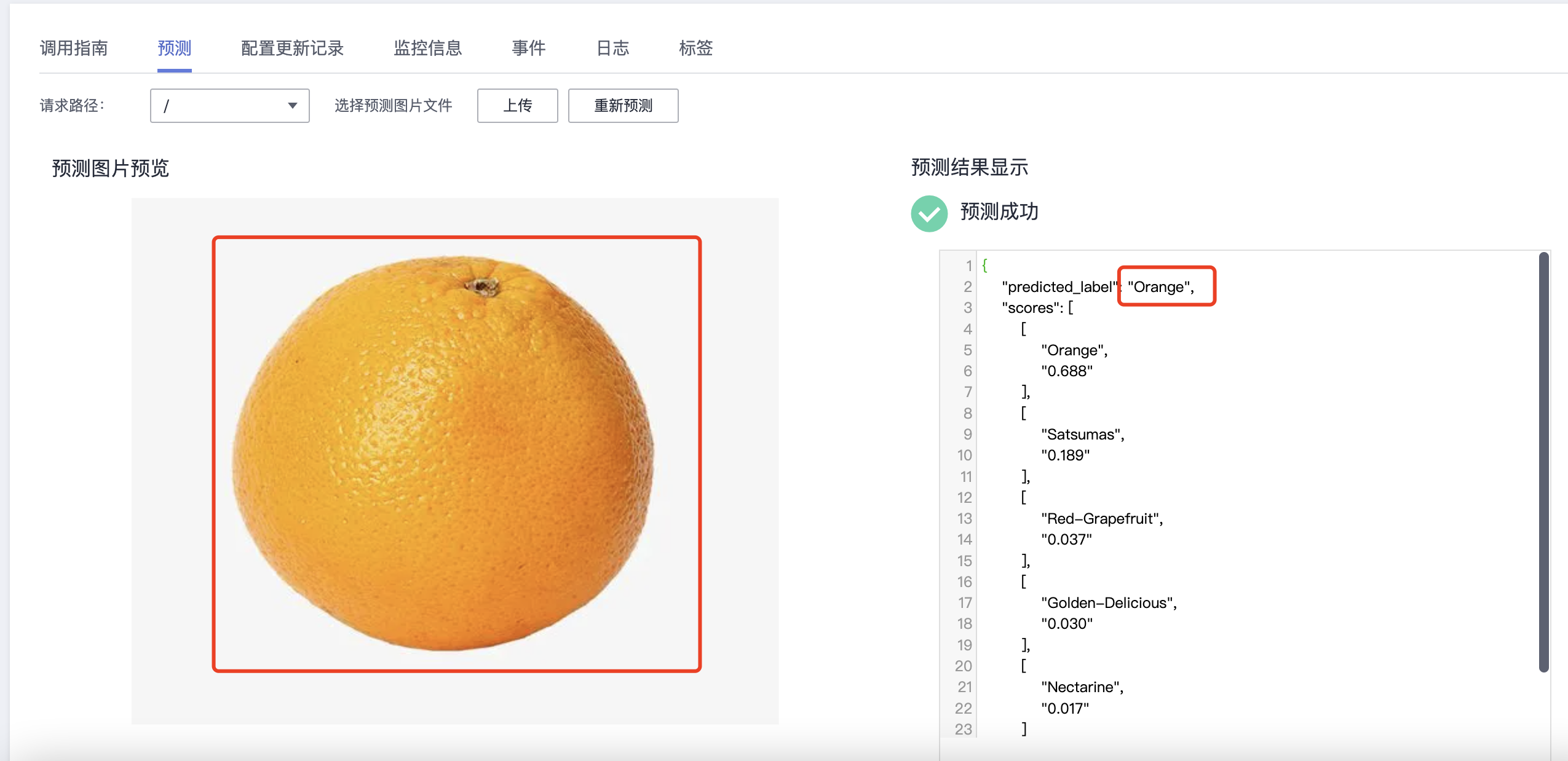 第一次,我上传的是一个橙子的图片,预测结果准确。
