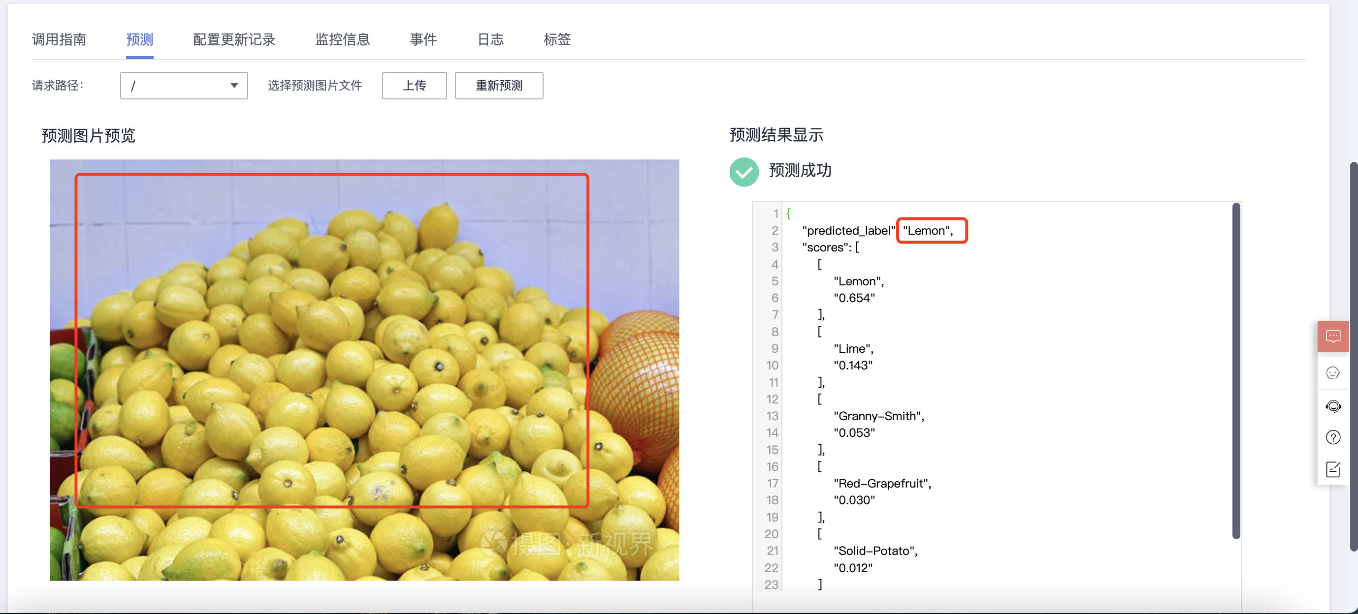 - 在“预测”页签,单击“上传”,上传一个测试图片,单击“预测”查看预测结果。
