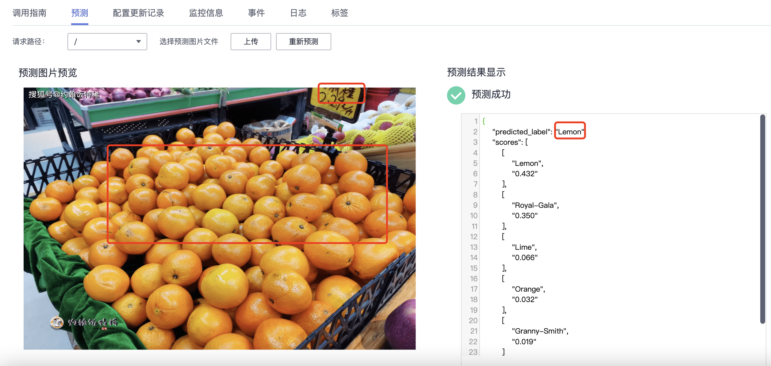 我做了多次的预测,有些识别结果有误差,比如我下面是一堆橙子的照片,但是识别的是柠檬。