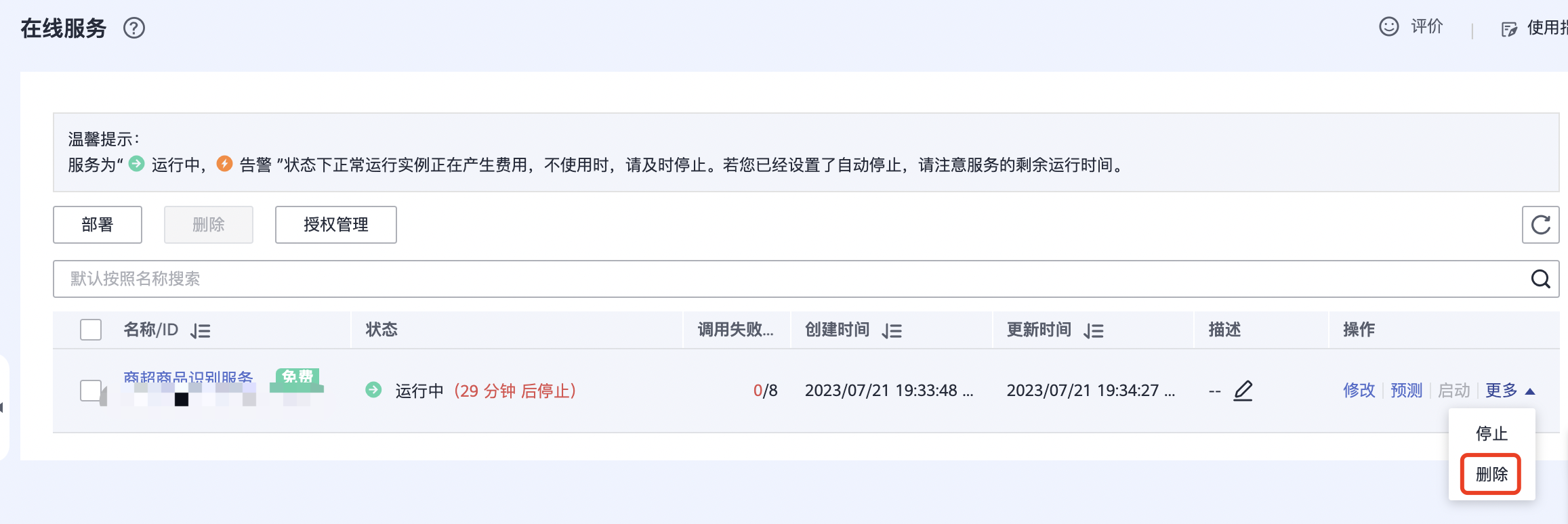 在“在线服务”列表,单击对应服务操作列的“更多 > 删除”。