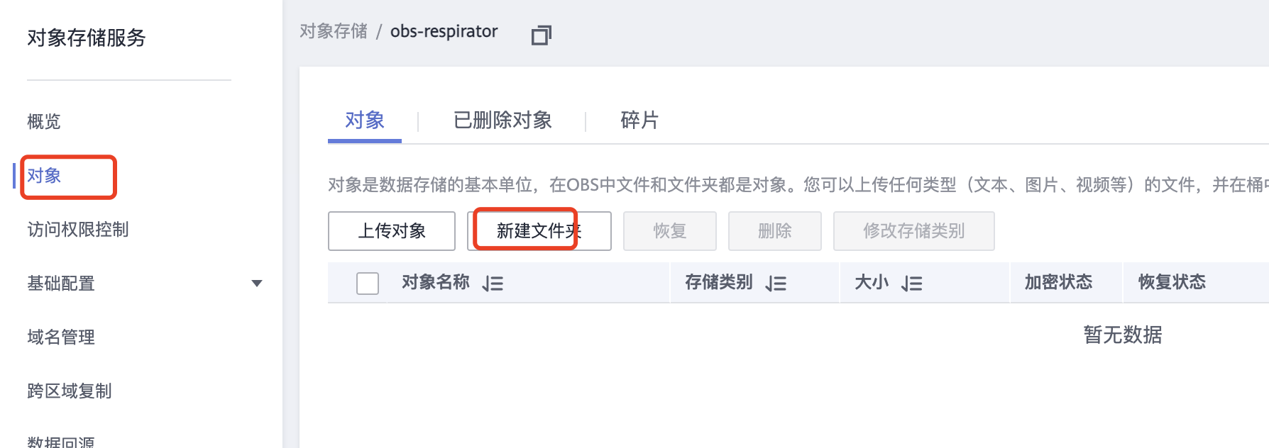 3、单击概览页面的左侧导航的“对象”,在“对象”页面单击新建文件夹,创建OBS文件夹。