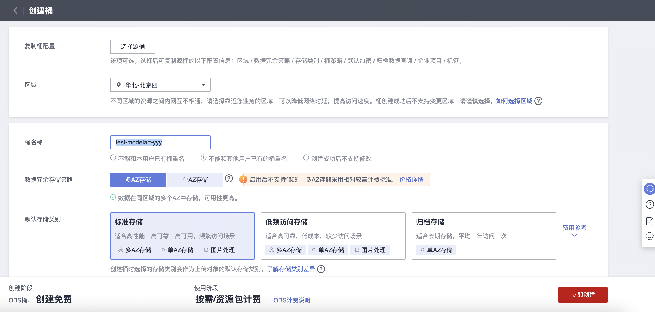 - "桶名称":创建桶名称“test-modelart-yyy”,注意重名时可以添加后缀。