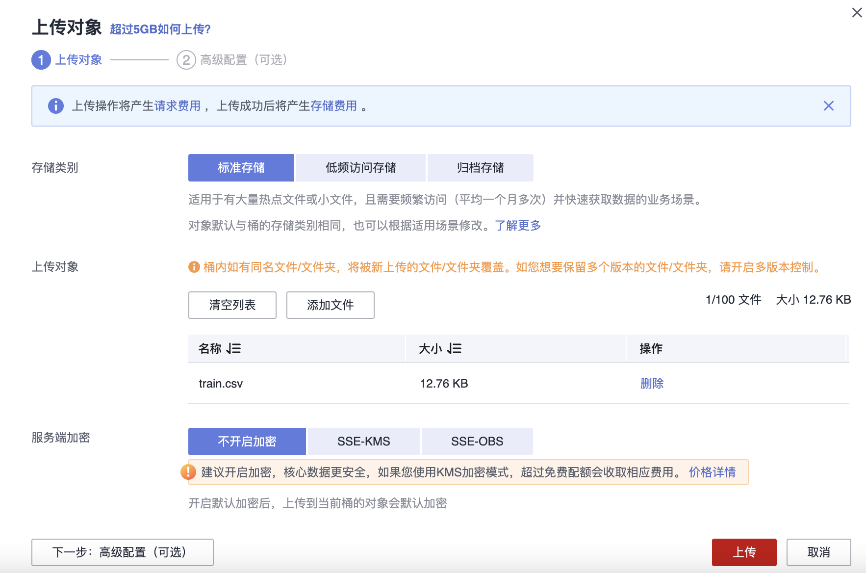 新建一个名为“bank-marketing”的文件夹,新增成功之后单击“上传对象”按钮。