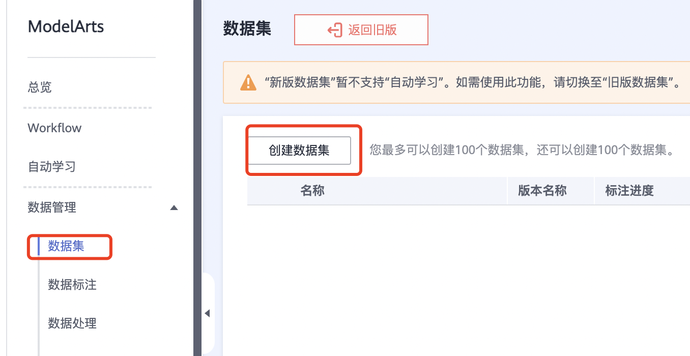 1、进入ModelArts管理控制台,在左侧导航栏选择“数据管理>数据集”,进入数据集管理页面。