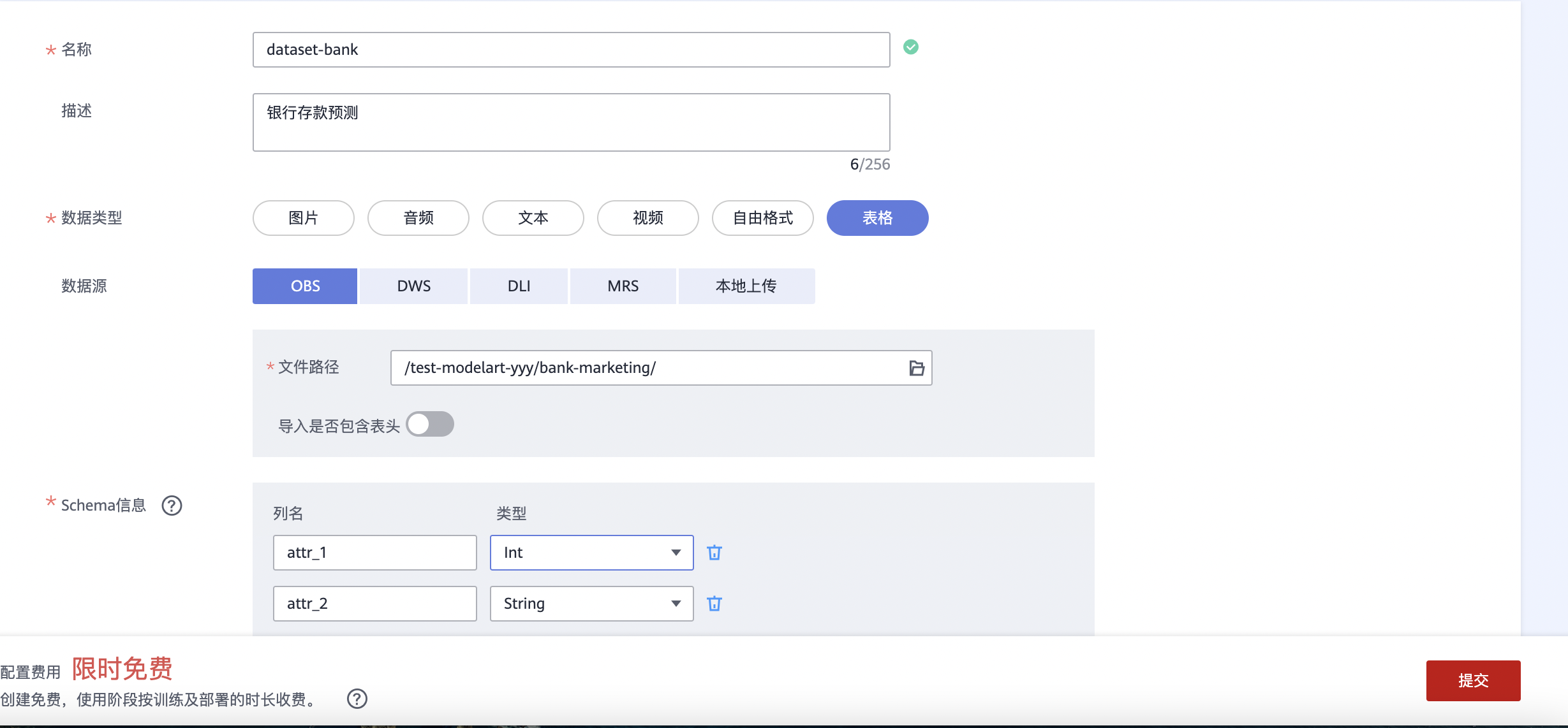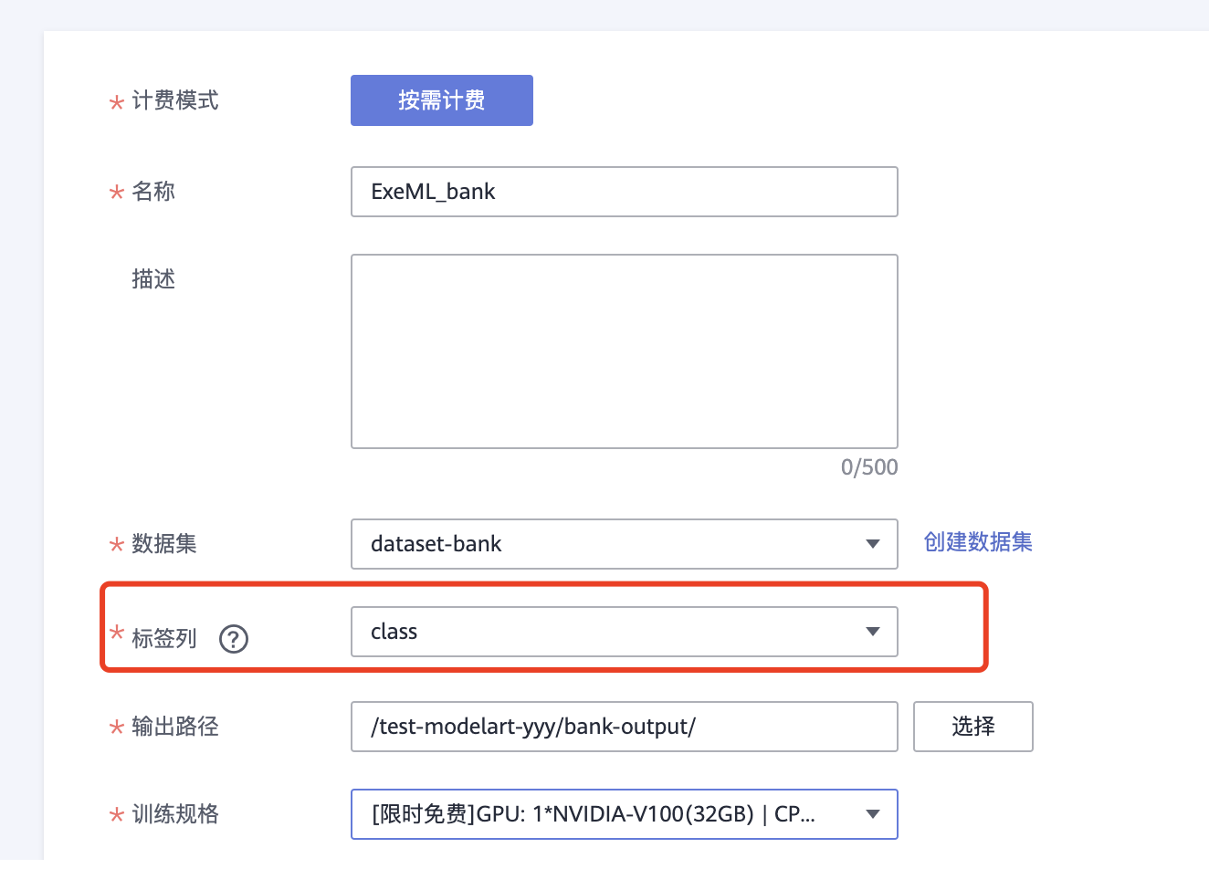 - “输出路径”:选择“test-modelart-yyy/bank-output/”。