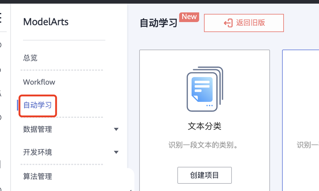 1、进入ModelArts管理控制台,在左侧导航栏选择“自动学习”。
