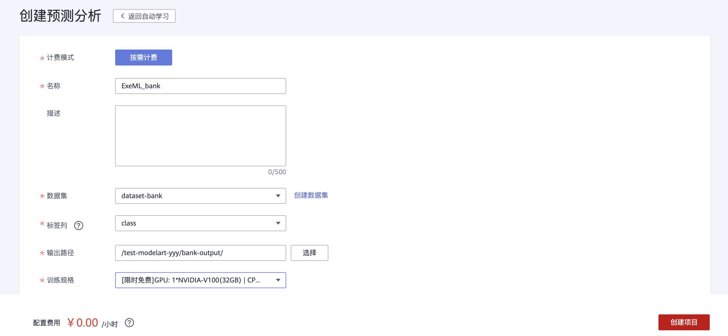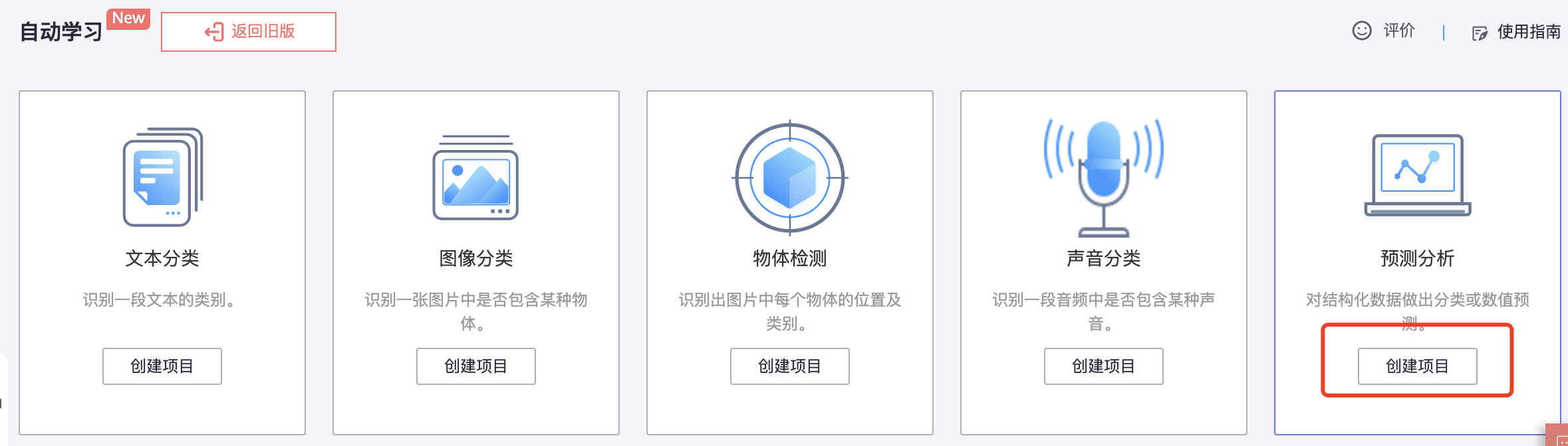 2、在“自动学习”页面,单击“预测分析”中的“创建项目”。