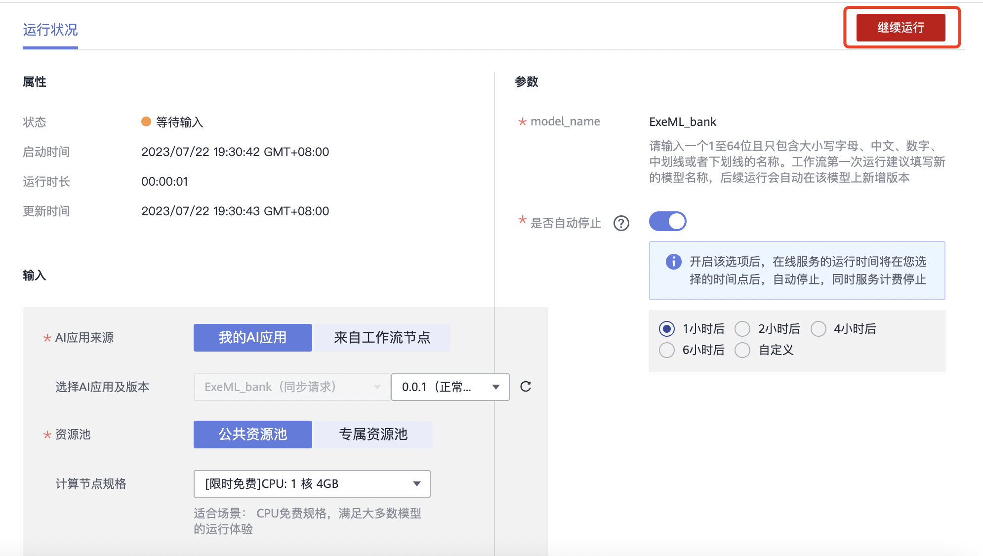 2、节点到达“服务部署”,状态会变为“等待输入”,需要填写输入参数: