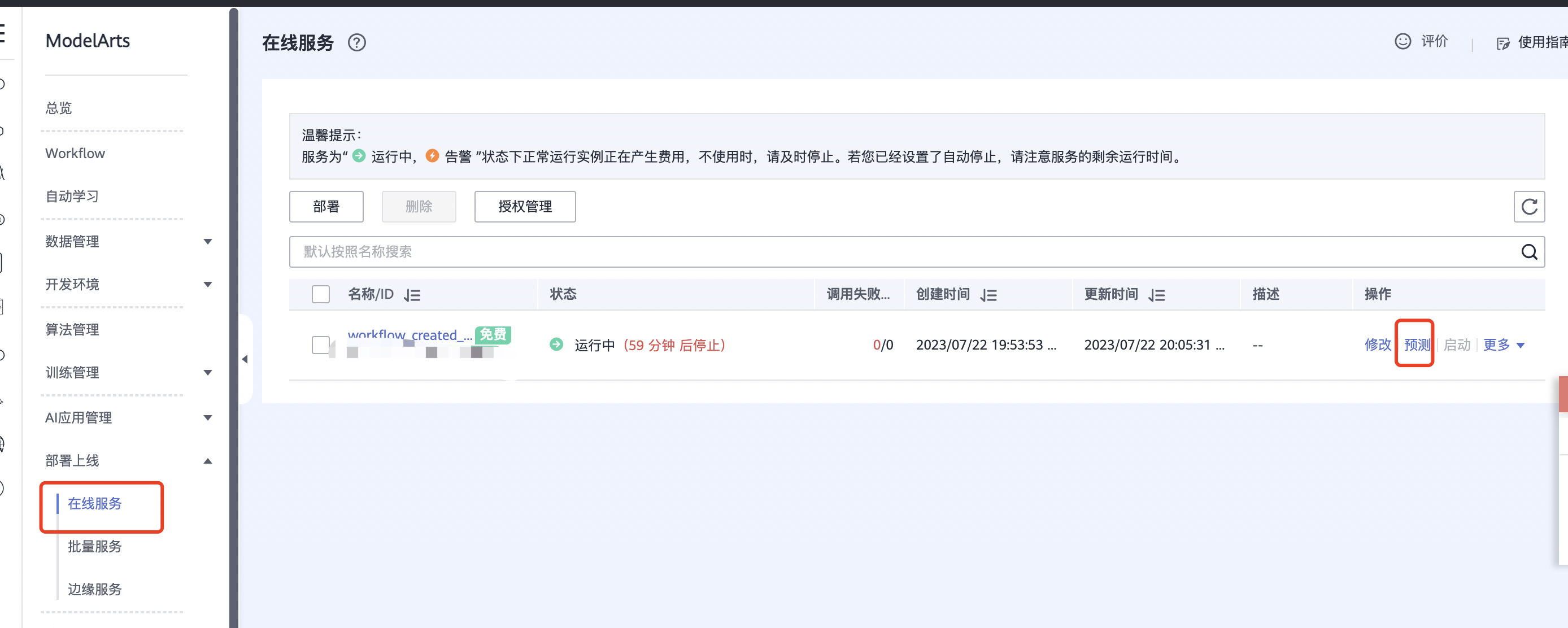 1、点击控制台左侧“部署上线>在线服务”,进入“在线服务”列表页。单击服务列表上的“预测”,进入“服务详情”页。